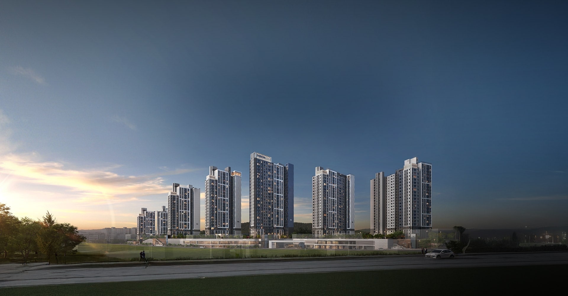 브랜드 아이덴티티를 살린 커튼월룩과 컬러 레이어가 입구, 필로티, 라인 패턴까지 통일감 있게 이어집니다. 지상은 공원형 조경 콘셉트로 설계돼 솔향기 테라스, 선큰정원, 산책로가 연결되고, 광폭 동선과 분리된 차량동선으로 보행 안전성을 높였습니다. 커뮤니티는 스카이라운지, 피트니스, 실내골프, GX, 게스트하우스, 북카페, 키즈짐, 스터디룸 등 전 세대를 아우르는 프로그램을 배치했습니다. 특히 남구 첫 스카이라운지는 태화강·삼호산 조망을 품어 ‘집 안에서 즐기는 힐링’을 구현합니다.