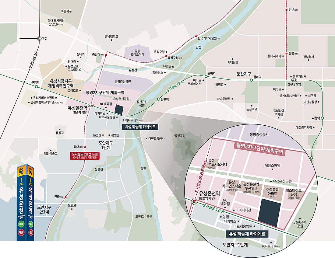 도보 약 7분의 1호선 유성온천역을 통해 대전역권까지 20분대 접근이 가능하고, 향후 2호선 트램 개통 시 더블역세권 위상이 확보됩니다. 계룡로·도안대로·유등로, 그리고 유성IC를 통한 호남고속도로 접근성까지 더해져 대전 유성 하늘채 하이에르 의 이동 효율은 도심·광역 모두 균형이 좋습니다.