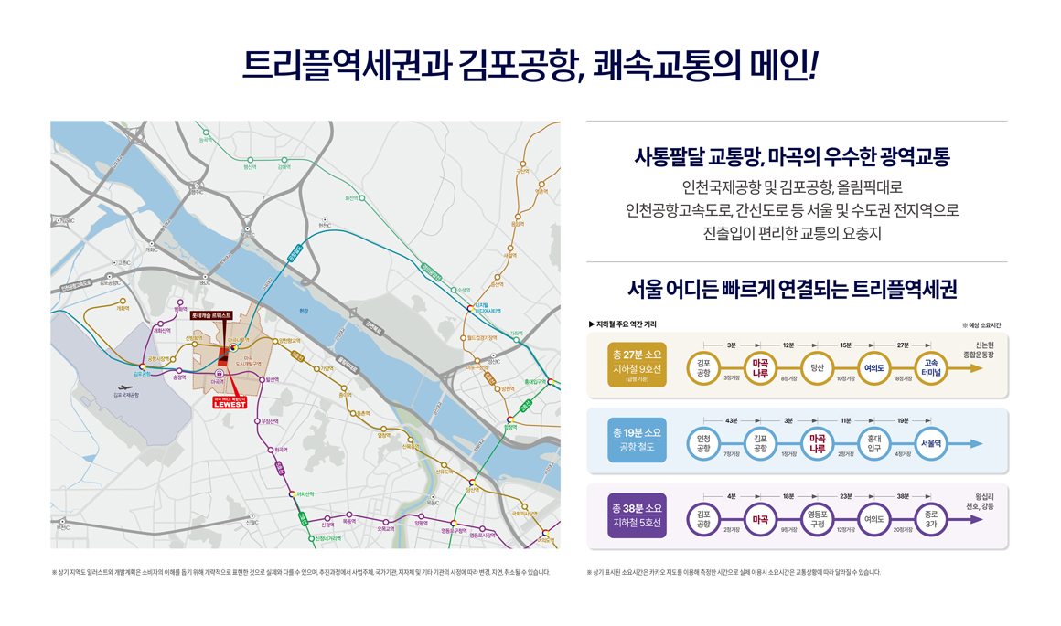 여의도·광화문·강남 어디로든 빠르게 이동할 수 있는 교통망도 강점입니다. 마곡 롯데캐슬 르웨스트는 9호선·5호선·공항철도(AREX) 환승 축과 맞닿아 있어 공덕·여의도·강남 및 김포공항·서울역 접근성이 뛰어납니다. 특히 마곡나루역은 9·공항철도 환승역으로, 도심·공항·수도권 광역축을 한 번에 연결합니다. 차량 이용 시에도 올림픽대로·서부간선 등 간선축 접근이 편리해 서울 전역을 1생활권으로 누릴 수 있습니다.