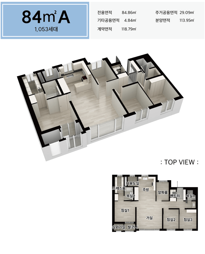 주력인 59와 84 타입은 4베이 판상형을 중심으로 가변벽과 알파룸을 더해 생애주기 전환에 대응합니다. 59는 주방–다용도실–거실이 직선으로 이어져 맞벌이 가구의 오후 루틴이 간결하고, 84는 침실군 분리와 팬트리, 광폭 드레스룸으로 수납 압력을 덜어 줍니다. 타입별 장단이 명확한 점이 일산 더 센트럴의 설득력입니다.